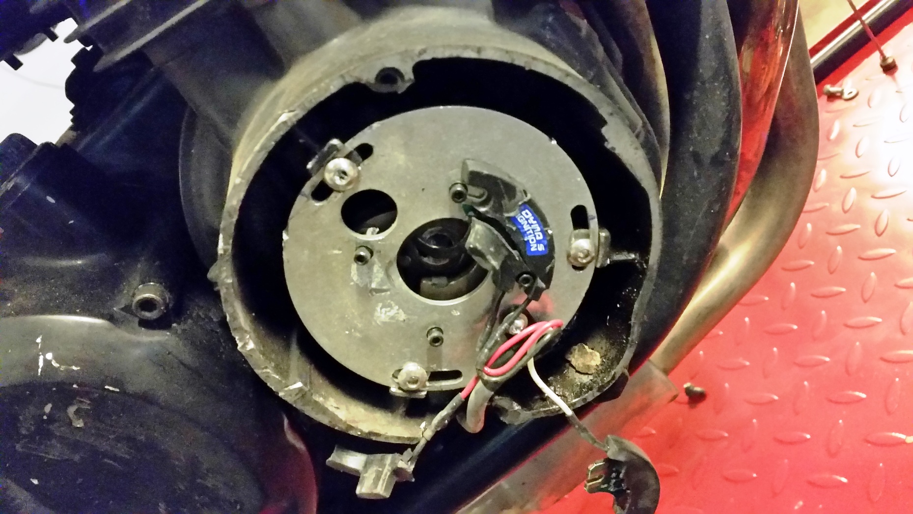 - The timing cover was smashed and the upper screw boss was obliterated. The lower one was already gone. The Dyna S ignition was FUBAR'd as well. The rotor screw was sheared off.
