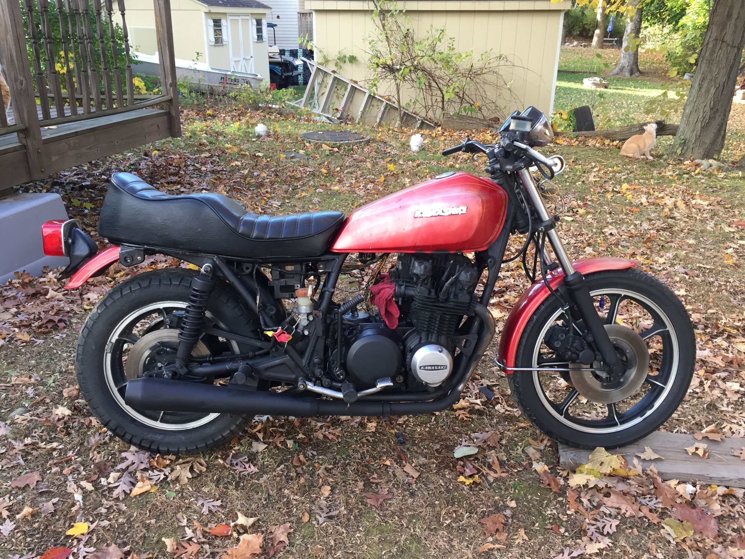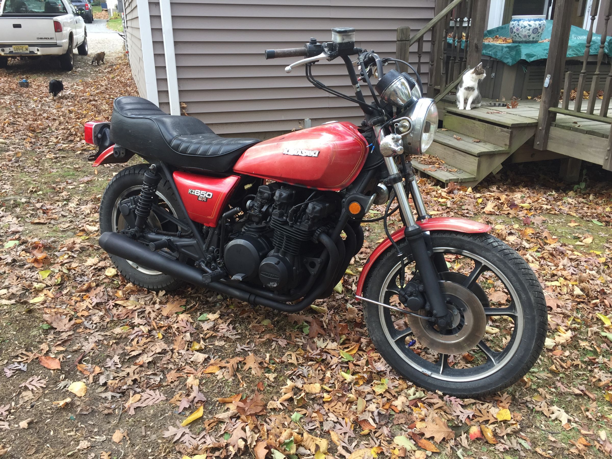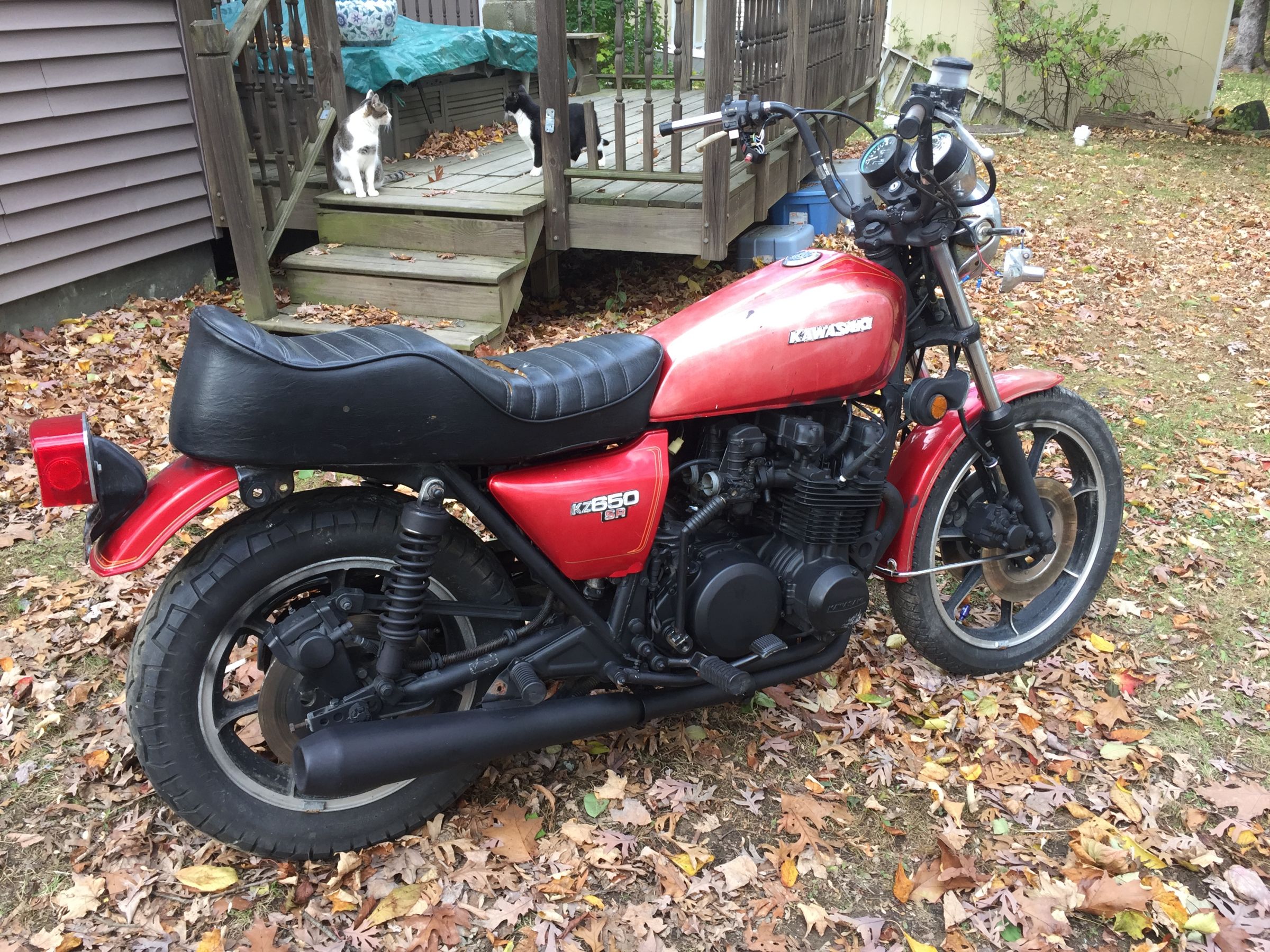 1978 KZ650 C2, 130K kms, Delkevic ex, EI, CVK32, PMC easy clutch, ATK fork brace, steering damper, braced swingarm, ZRX shocks, 18" Z1R front wheel.