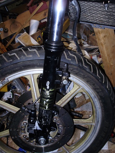 Some time in the last couple months, a thought of better braked for the front might be in order. Looking at ebay (again), was a front end from an '83 GPz with axle and spacers, brake caliper with lines and triple trees. I later got the upper yoke with "clip-ons". An order to All Balls for steering bearings to mount it on the '77 frame. Ebay again for new fork seals. Recently did the rebuild for the forks and assembled them on the frame. These forks are wider and use bigger diameter tubes. The fender I used from the original forks is too narrow to use. Hmmmm opportunity to make a a fork brace from angle aluminium to use as a spacer for the fender mounting. I'm going to have to use different means to mount the headlight. A electronic or GPS speedo and electronic tach mounted on a custom mount is in the future. IKON 7610 shocks maybe someday.
