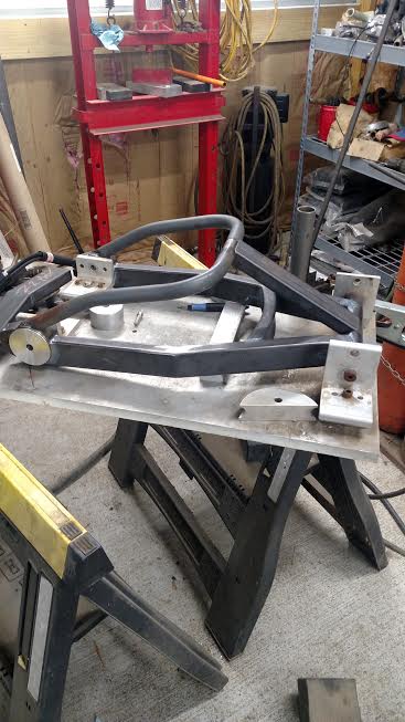 Okay, quick mock up with shock mount tacked in place. Pretty happy with geometry at this point so I'll weld them permanent along with chain guard tabs and brake stay then off to powder coater.