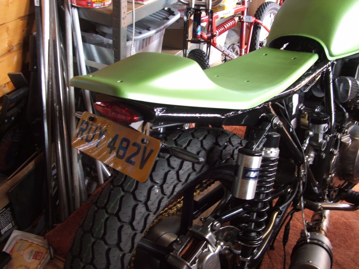 Tank and seat unit sprayed in pearlescent Kawasaki green.