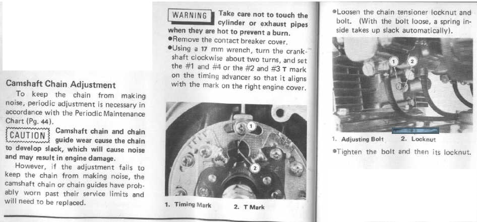 Before trying to adjust the cam chain tensioner be SURE to read how to adjust it (see below). The crankshaft MUST be turned to a specific position before trying to adjust it.
