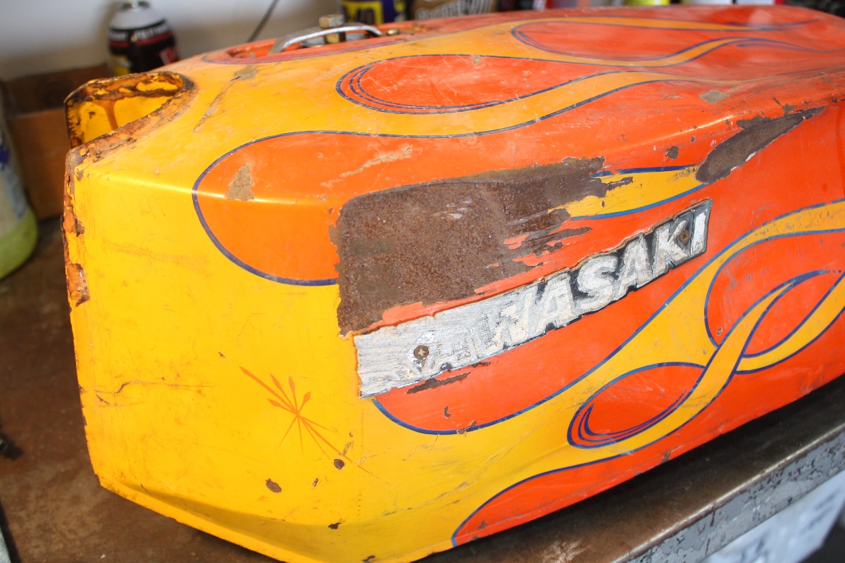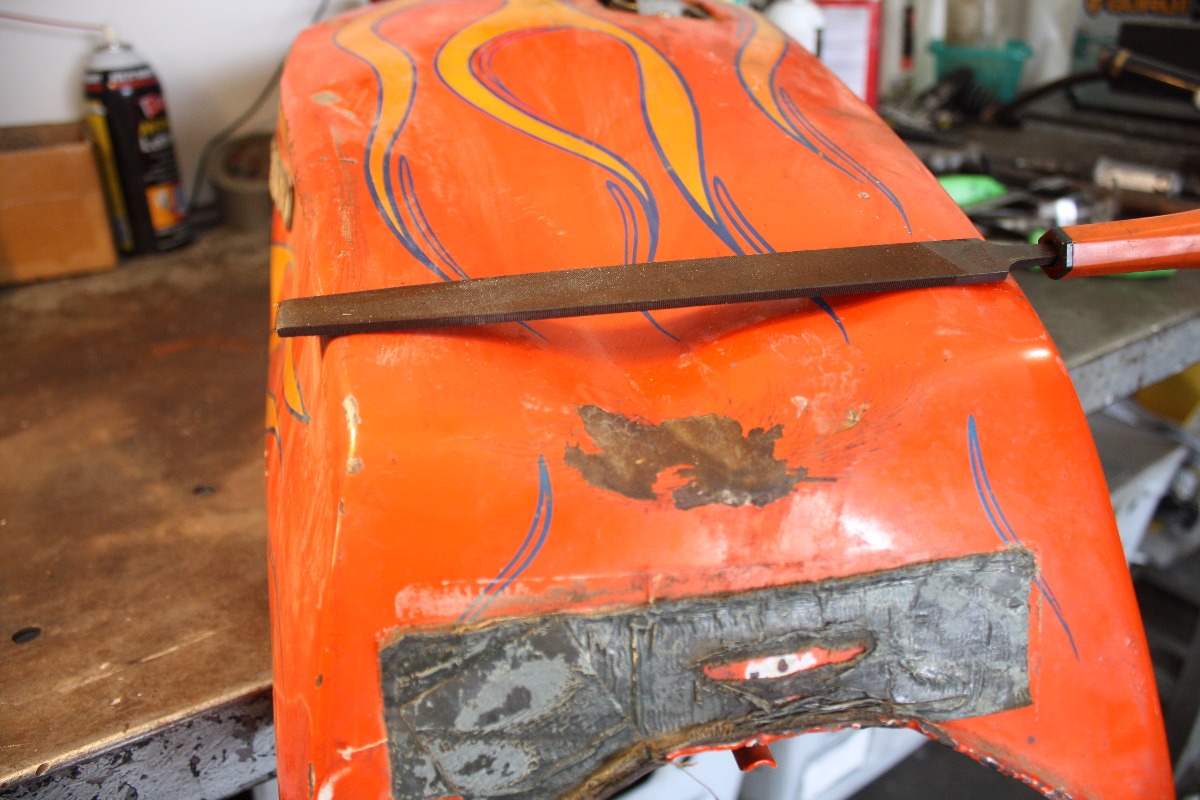 I was able to remove a pretty good amount of damage just with pressurizing the tank and some heat. But there was no saving the crease on the back top edge of the tank so I had to cut that out. I made up a puller and tack welded carriage bolts to pull out specific areas and used a mist of primer to work the high/low spots so there should be minimal amount of filler needed. I have a MIG but know from experience you're wasting time trying to get a air tight weld with it, so I'm going to get someone to TIG the repair panel in. Still have a couple more spots to work on yet.