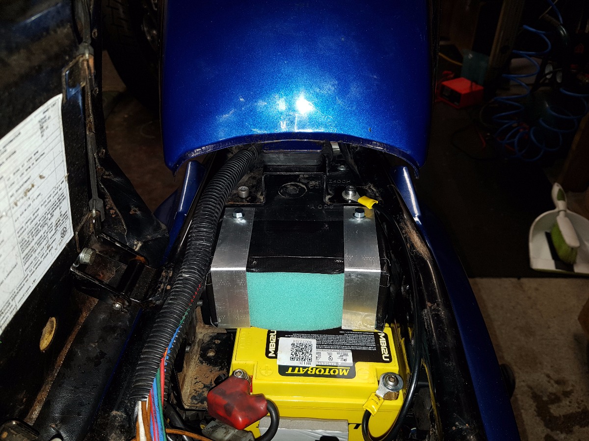 I had been thinking for a while how I was going to create a new air filter. I bought some UNI filter sheet and cut 4 pieces to fit. Then I folded some 25x1 Aluminium flat to make some holders for the filter element which I held together with duct tape. It turned out pretty tidy, see photo below. I got a new battery on Saturday and chucked that in too. So by Saturday evening I had her ready for the resurrection maiden voyage...