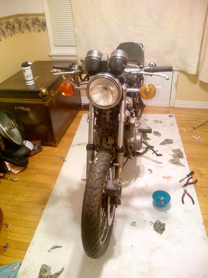 i put on a front fender from a 84 kz550, i did some more electrical work, removed all of the tube fuses and put in blade fuses to make it easier to replace. I removed the old hand controls and wired in ones from a 08 zx14, so now i have positive blinker cancel. ive been debaiting selling it just because the exhaust is too loud for where i am at...but i also might build a 2-1 exhaust for it using a exhaust i had for my rf600