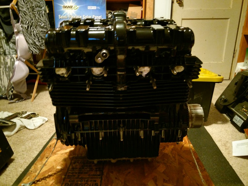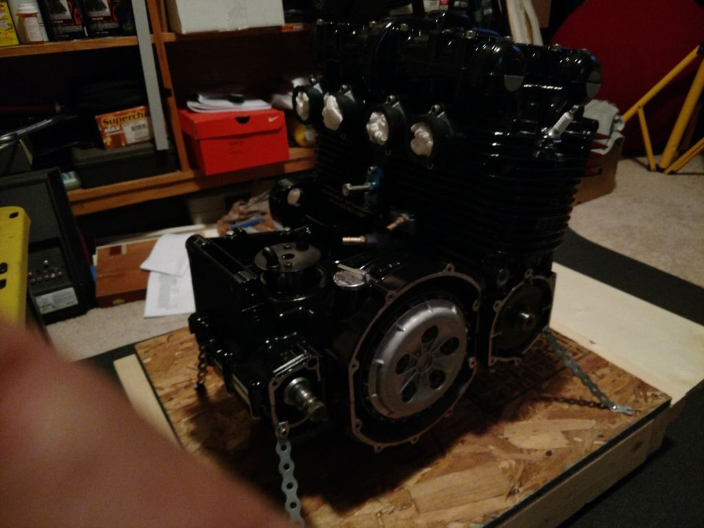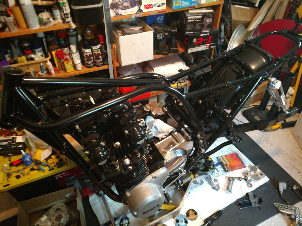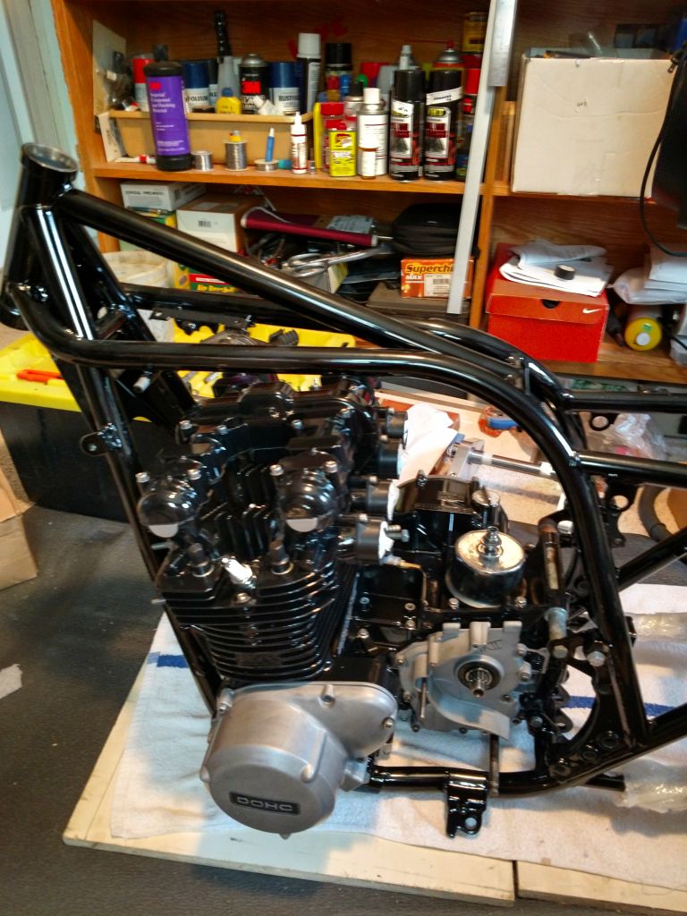 Her are some updated pictures. I have mounted the engine to the frame, mounted the swing arm. Also mounted the new rear shocks.