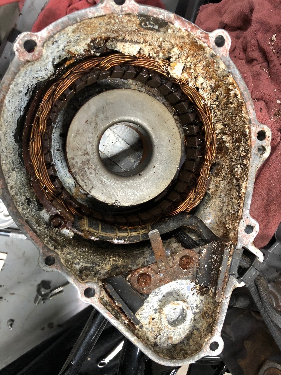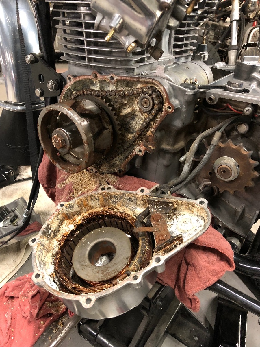 Started the day getting the rear hub and such mounted on the bike. Also finished up the switches on the bars, they look and work great. The starter used to act up back in the 90s and I almost forgot about it, until we went and turned it over. Got the side cover off, and holy hell, it looks like coral was growing near my stator :woohoo: Started to remove the starter, and whomever owned it before me, broke both 10mm bolts halfway off, wtf! So now we have to drill those out, but we ran out of time today. On the way home I smashed a big buck, ran right out in front of me. Wasnt such a great day, but theres always tomorrow!