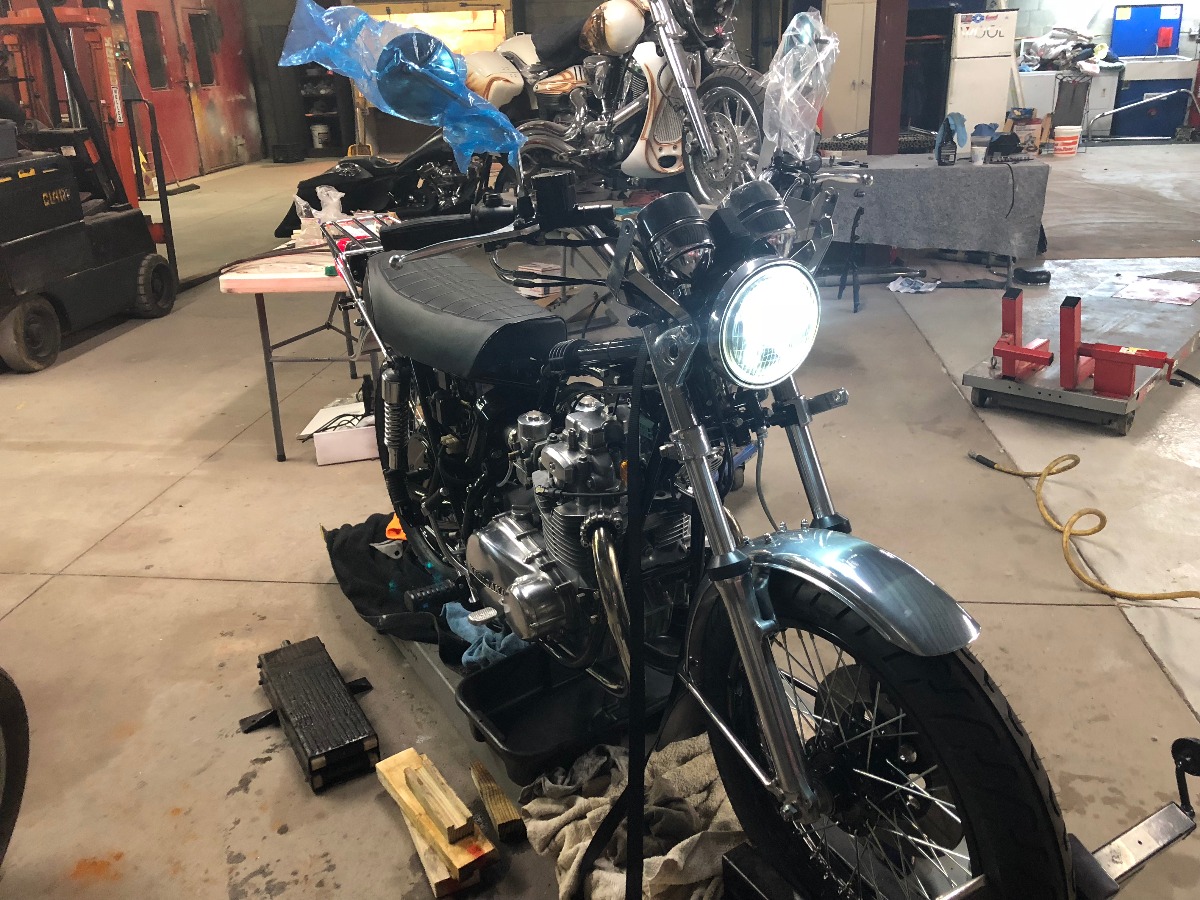 After messing around with the exhaust from the 77a1 we’ve decided to make custom mufflers w baffles. Then when I was putting the chain on I noticed there a rubber stopper on the left muffler to stop the center stand...so we are gonna weld a stop on the center stand. Got the front tire mounted, replaced the rusted out front fork top bolts, the carbs from the 77a1 had the rubber plugs, one of the carbs on my 75, the rubber plug fit nice, not the other one...gonna use something here at the shop for that one. I got the specs and still will need 2-4 more for the other bikes. The stator will be back together, along w the sprocket cover and all of that. Soon I will have to start sanding the parts for paint.