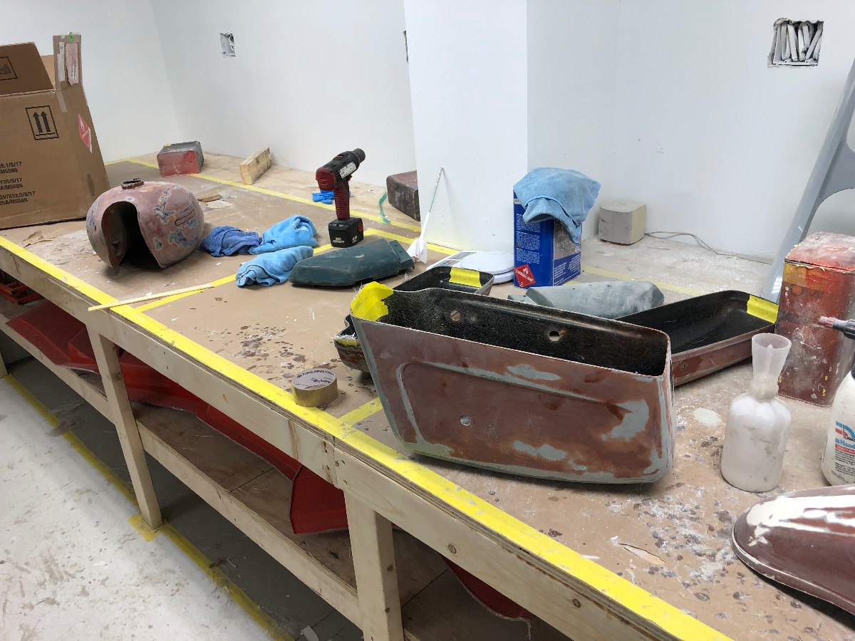 Since the center stand relies on a rubber bushing coming off the stock mufflers to keep it from springing all the way up and into the chain (Blake is going to make a pair of stainless mufflers w 8 inch baffles), Tim is going to build a stop for it in the next few days. I have a small oil leak from the oil filter, gonna drain the oil tomorrow and pull that back down and see whats going on. All the body parts have been knocked down, and Zack at Unit 6 Motoring is going to start fixing the fiberglass stuff tomorrow and Im gonna try to lend him a hand.