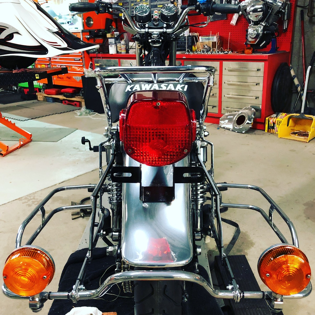 Spent most of the evening tonight bolting up the framework for the saddlebags. Also got the rear turn signals mounted and wired up. Too bad the whole frame wasnt tube, not very many options on running the wires. Took the turn signal relay off cause my signals were not working, and it sounds like jumpin beans inside when shaken...the orange lead was rusted out also. The 77 cadaver has a similar one, but its 3x as long. Going to take that one to the shop next time I go and test it out. Ebay ranges from $18/used--60/nos. Also noticed that my brake light is not engaging on the tail light, but lights up on the tach (both front and rear brake tested). I only had the one 1157 bulb, it looked fine. I have a couple laying around here Ill take with me to the shop next I go. Zack from Unit 6 spent several hours this evening doing body work on the parts, another couple hours and they should be ready for primer. I sure do wish someone handy with photoshop could duplicate the under seat stickers and rear inner fender stickers. Reached out to several of the places mentioned here, and that I found online, all saying not a demand for the time, etc. Only see a Japanese sticker set. Another day in the books. Goodnight