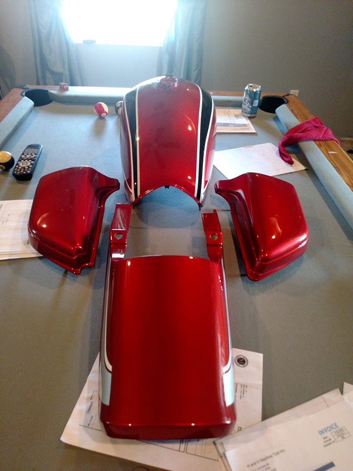 Okay, update. Been a busy 6 months since I started this build and have made zero progress on my end but did get to pick my paint up yesterday. Here's a couple pics. The black stripes on the tank are actually pearl purple, looks black till you see it in the sun!