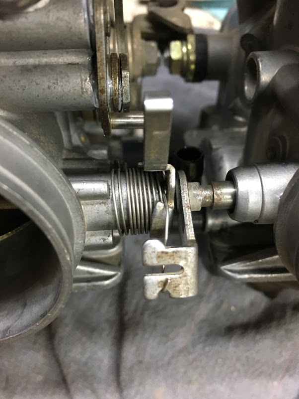 I would be done, HOWEVER the choke linkage is giving me fits; specifically, the 2-3 interface isn't returning no matter how much I wind the return spring. I've loosely assembled the carbs in the mounting plates to ensure free rotation of the 3-4 choke shaft to no avail. The manual doesn't show a washer between the 1-2 choke shaft and the #2 carburetor, but the end sticks out slightly, causing the spring to move into the smaller diameter and lose much of its tension. I've seen a "fix" for this damn spring, but will try a linear spring to assist if all else fails.
