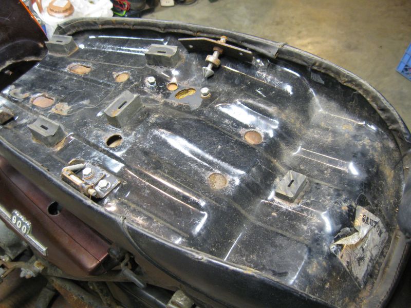 We're really sorta speechless regarding how good the internal tank condition is! I don't have a way to get good pics of the lower rear corners of the tank, but a long, flexible bore light reveals surfaces almost as clean. No loose rust at all! Looks like a fine candidate for gentle electrolytic rust removal with a 12V battery charger and washing soda.