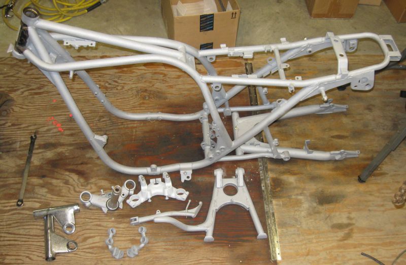 All the steel chassis parts parts were blasted with crushed glass; that was the only way to effectively remove the deepest-pitted rust . The pitting on the frame was so deep in some places that it is still visible if light hits it just right even after repeated prime/sand cycles. Hi quality etching primer was applied to everything, then gloss, semi-gloss and matte black paints were sprayed where appropriate.