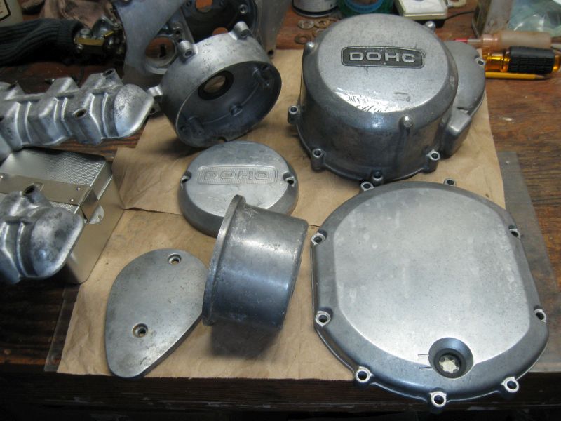 We've already established that over three decades of inactivity in a PNW barn was not kind to the finishes of this bike. The before pics at the beginning of this thread are representative of the painted finishes. Below are some before pics of the polished aluminum after bulk chemical degreasing outside with de-greaser and a hose to get them clean enough to go in the parts washer. They're cleaner than they look. What's left is very stubborn creeping-crud corrosion and the resulting pitting. After these pics, final washing in the parts washer, and finish washing with strong detergent & water was done to prep them for vapor blast.