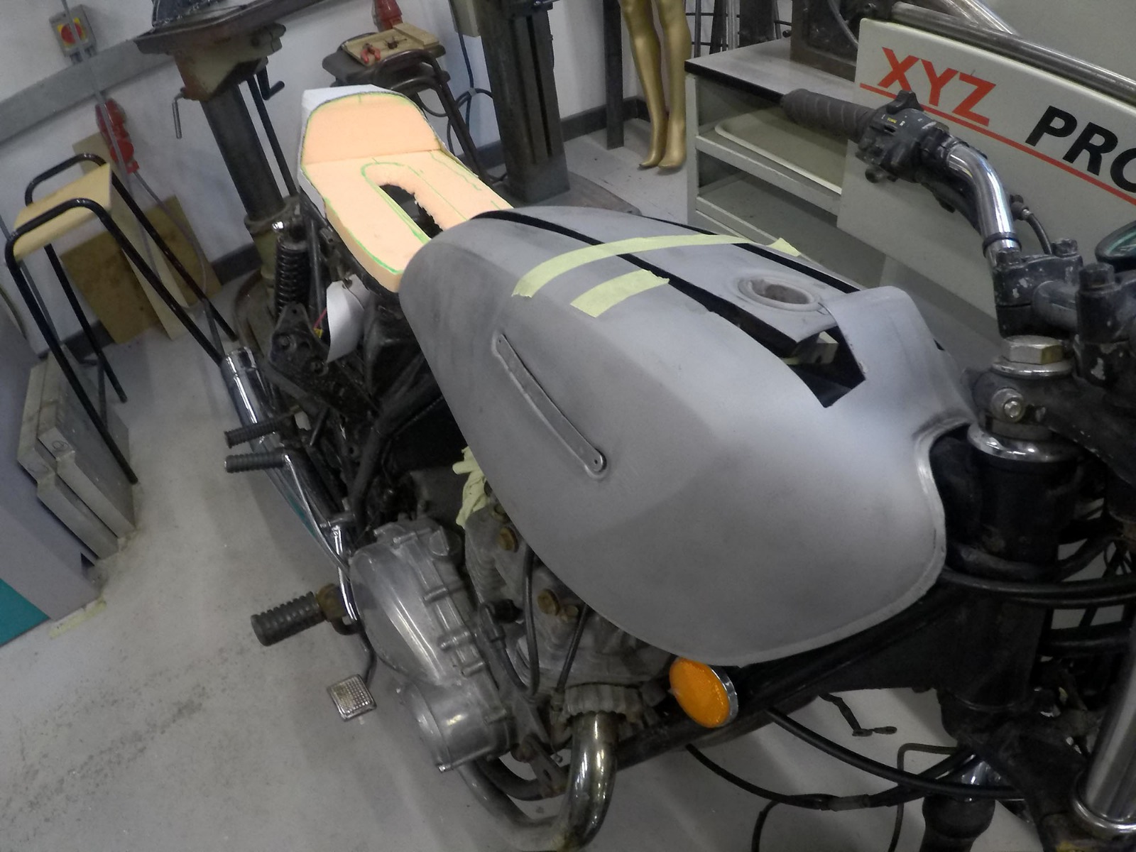 Not much progress this week. I sand blasted the tank, found more rusted area, the plan now is to look for a good looking petrol cap and fit it before I close the tank.