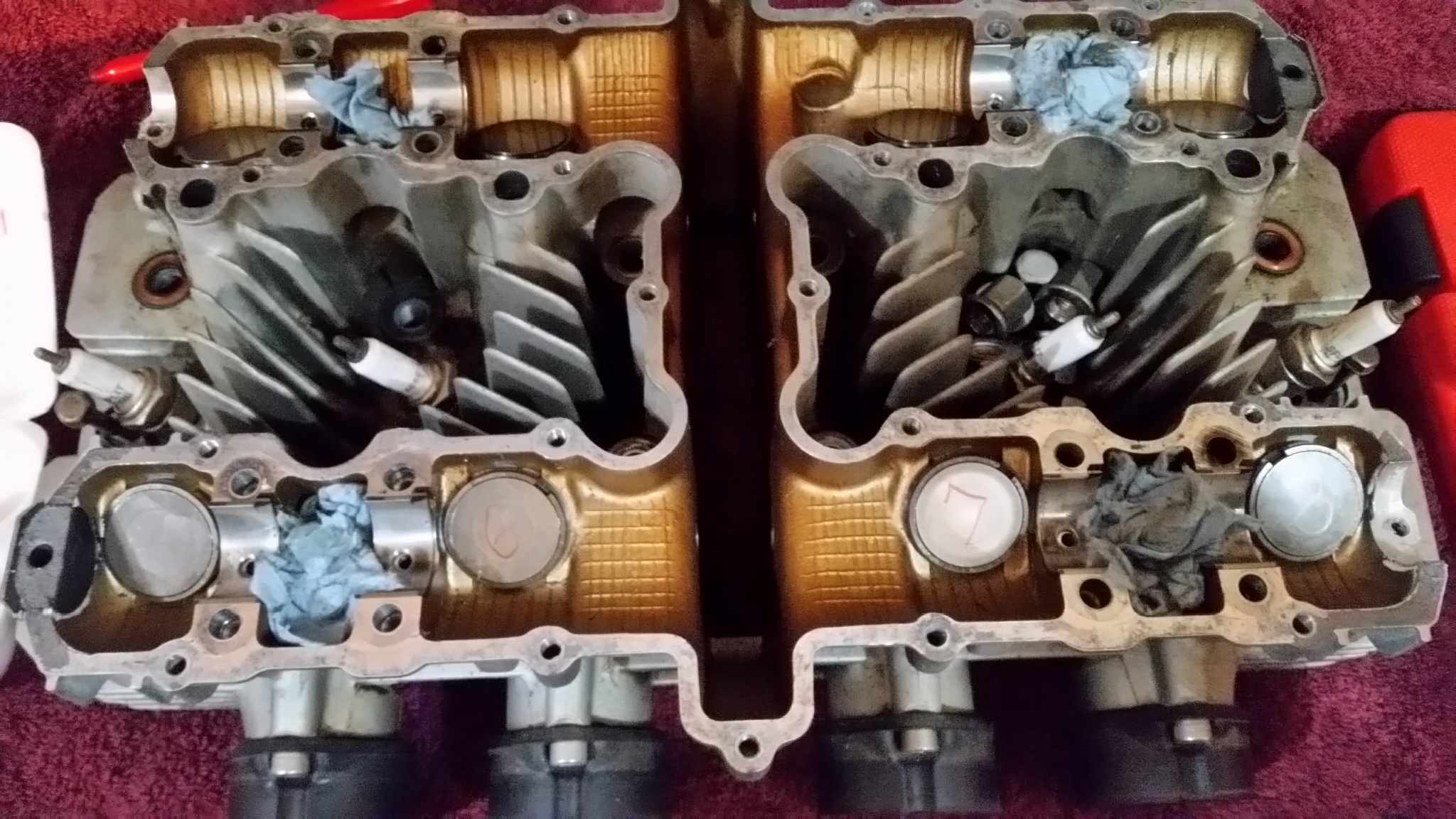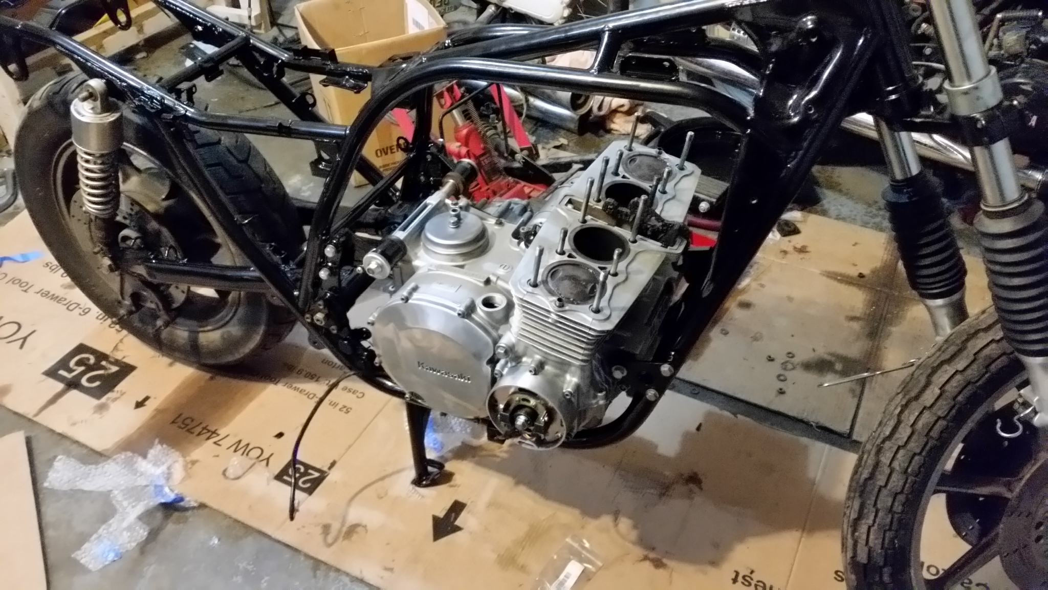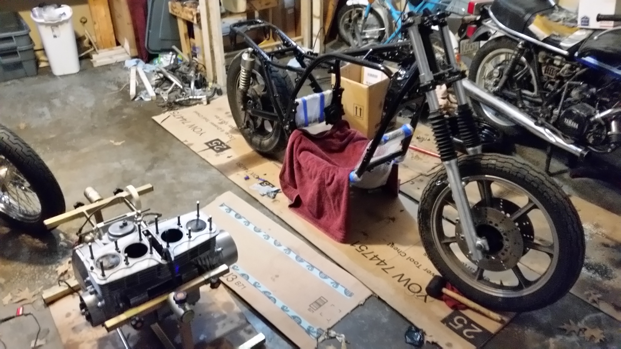 Good progress today. Got the front end installed with new stearing bearings and fork seals, slid the motor in the frame (with help), assembled some of the battery box and popped that in (less of a struggle with empty frame), and removed the valves from the head for cleaning.