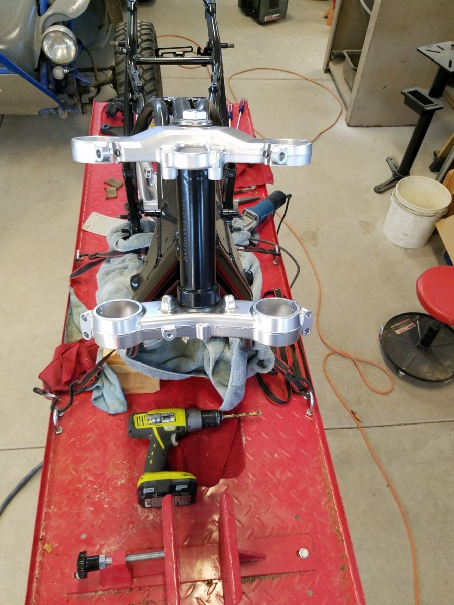I switched the handlebar clamps, and the position is much flatter. Looks more like the one piece Superbike bars the way. It does look it may be too narrow for the gauge cluster. Looks like I may have to push those forward to clear the risers.