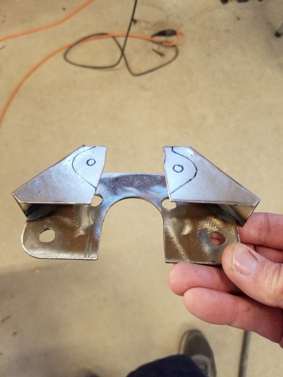 I started to mock up a mounting bracket for the guages and headlight today. Keep in mind the bracket pictures are the part in *rough* shape, still need to trim and fine tune it. The main plate is 11 ga. steel, and the two side pieces are 16 ga. steel. These two will be supporting the ignition switch only, so lighter works just fine. The thicker plate will be bolted directly to the bottom of the top fork clamp, and will be holding the guages and the headlight. I managed to use the stock headlight bracket without modification. I will tie in the bottom of that bracket with the theaded hole in the bottom of the lower fork clamp.