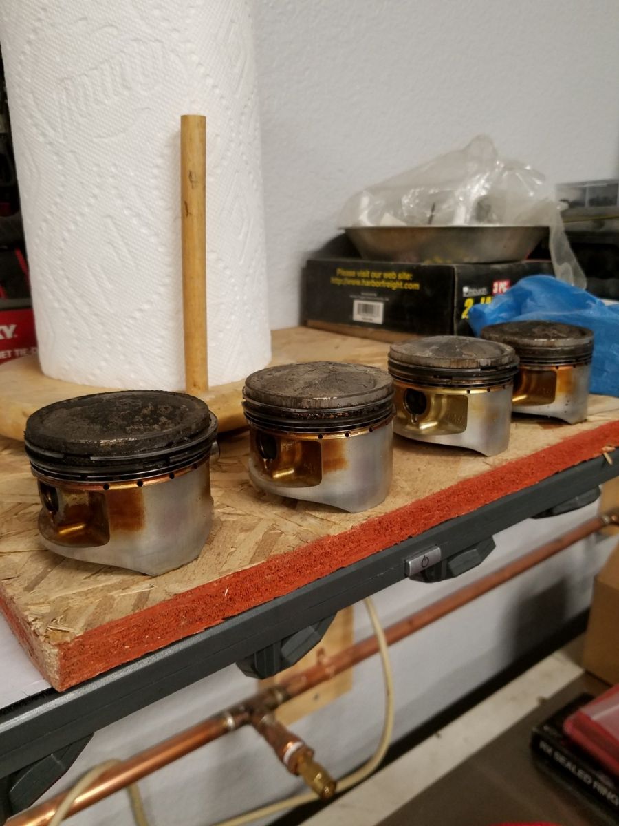 I got the cylinder studs and pistons removed today. Interesting discoloration pattern on the old pistons.