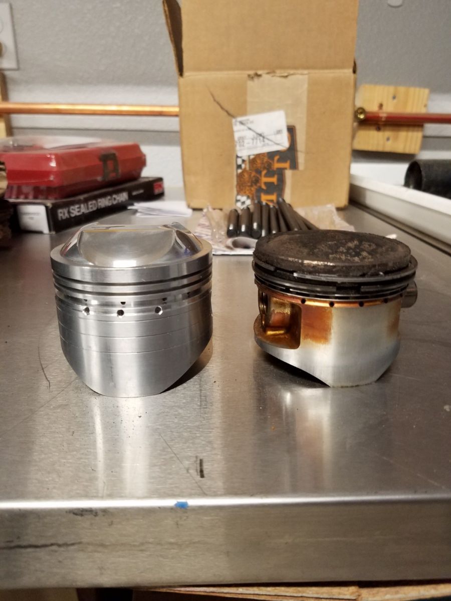 Here is the comparison shot of the stock piston next to the high compression piston.