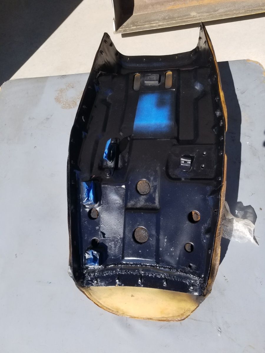 I ended up having to add a strip of steel sheet to the front of the seat pan to repair rusted through metal. I wish I learned how to TIG weld! Using a MIG welder for thin sheet is difficult at best, so don't critique too harshly. Some painting and clean up and it will ready for the upholstery.