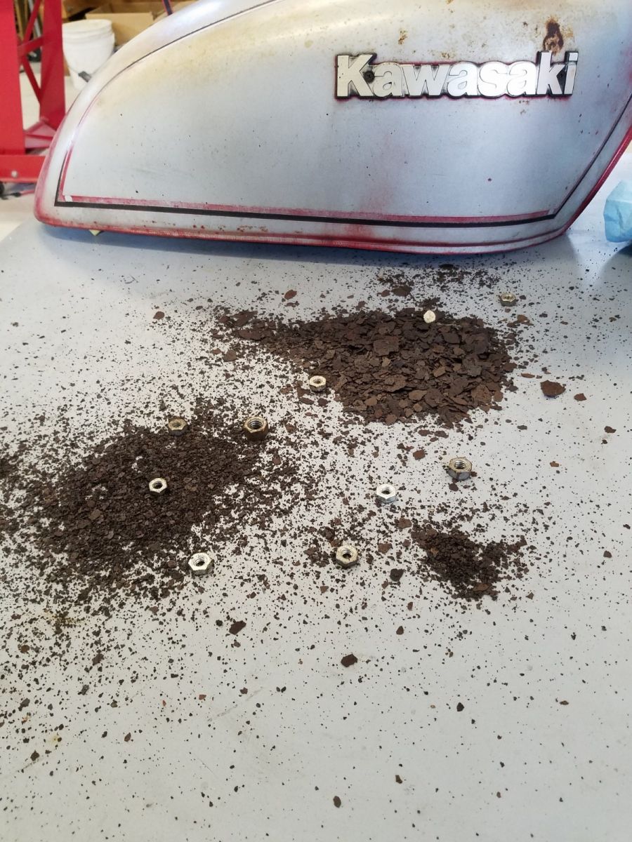 After draining the 28 yo gasoline and letting the tank dry inside, I threw in a handfull of nuts and got to shaking. Wow. I didn't expect this much to come out...