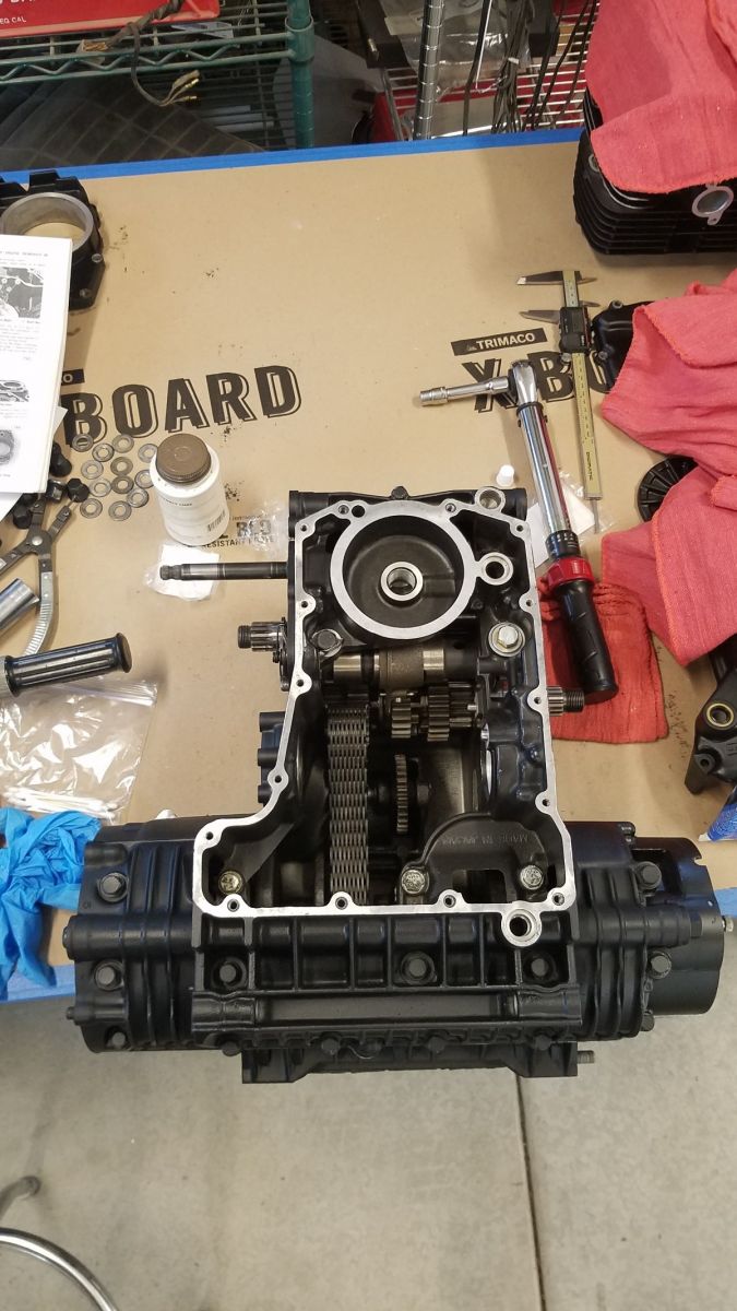 The 6 mm lower case bolts should be torqued to 87 in/lb, according to the shop manual. I verified the torque setting several times, but my torque wrench isn't clicking. I am at a tension that I do not feel comfortable going beyond, for fear of damaging case threads. It may be time for a new torque wrench. Cheaper than messing up the case threads!