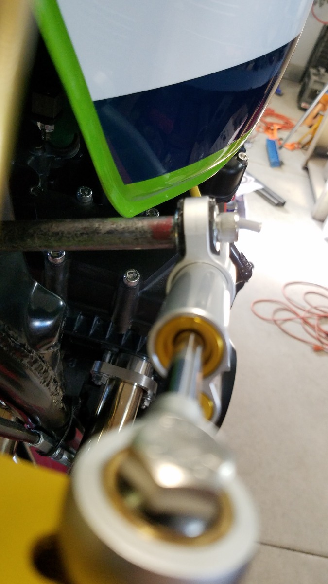 My Ohlins damper did the same thing. I just placed a thick o-ring between the the Ohlins damper bracket with the heim joint to where it mounted to my fairing bracket.
