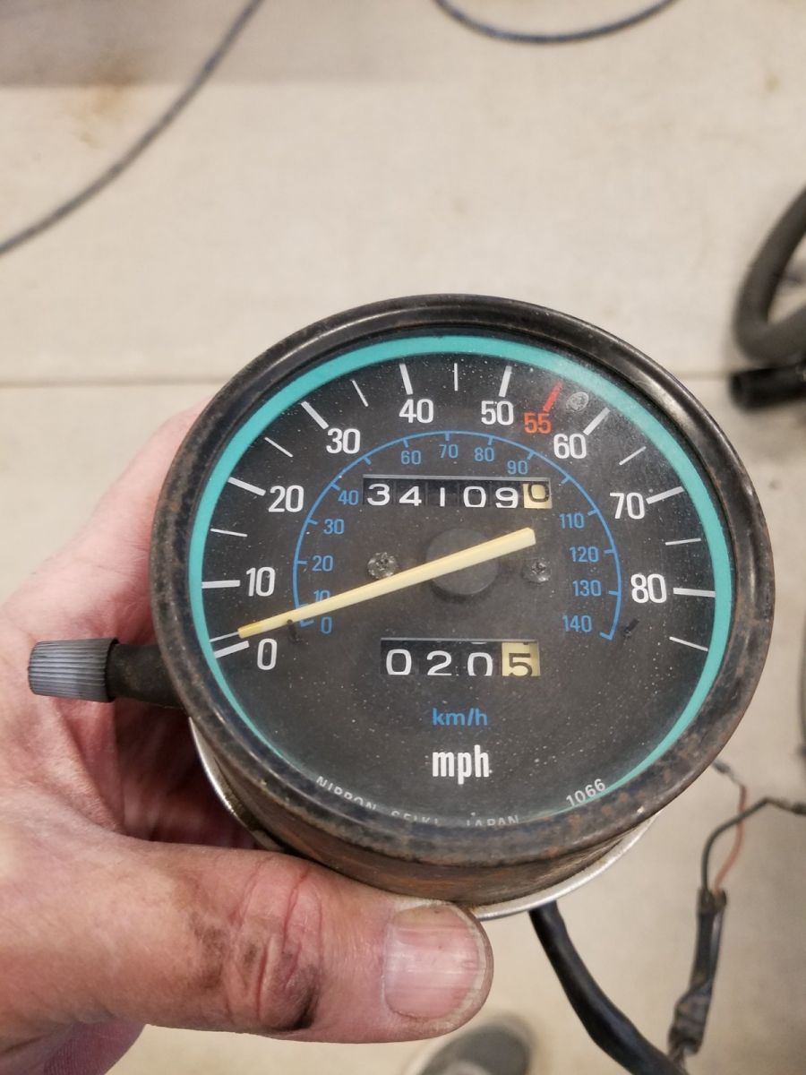 I disassembled the tach for two reasons - refinish the bezels due to mild rust, and black out the light green around the edge of the gauge. I think it looks cleaner this way. Posting a pic of the stock speedo for comparison.