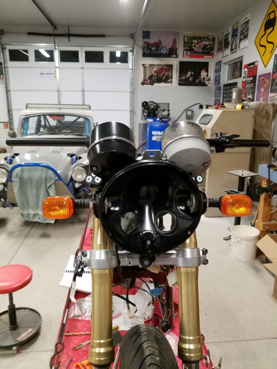 I attached the bottom of the headlight bracket to the lower fork clamp using a 1/8" wall steel angle I had laying around. Now the the fitment is confirmed I will blast and paint it.