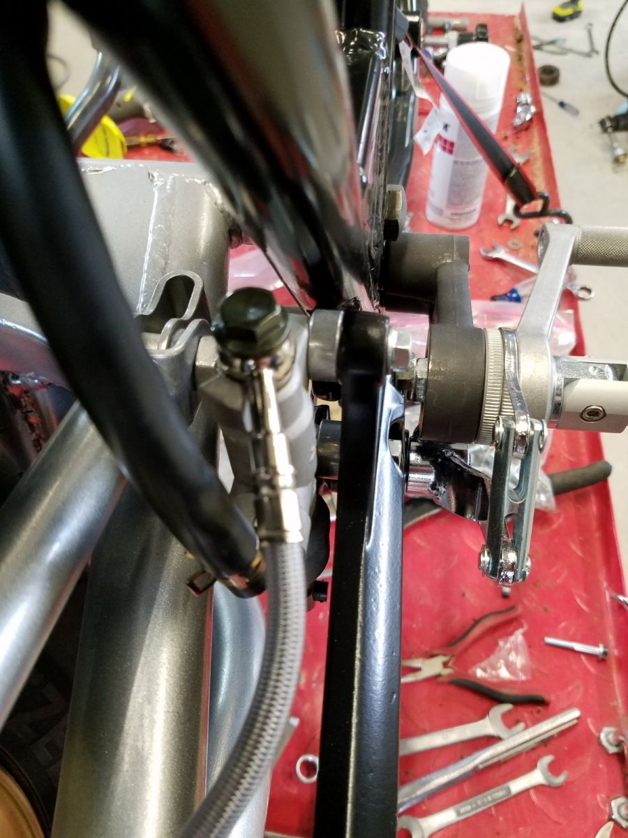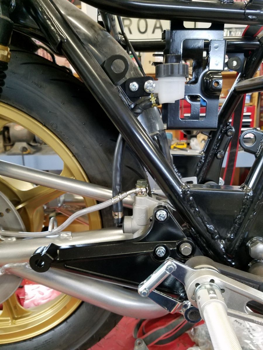 I am still working on the finish of the rear peg mounts. I got my braided brake line for the rear, just need to complete the painting before bolting it all together. The seat pan still needs more welding before the upholstery shop takes over. All of the plastic bodywork is at the body shop. I need to get off my butt and clean out the fuel tank so he can get everything primered for the finish paint. Then there is the motor...