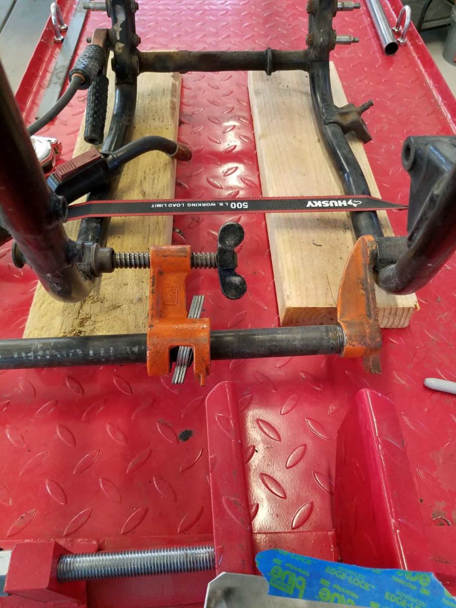 By reversing a bar clamp, I preloaded the lower front engine mounts outward .25" before welding.