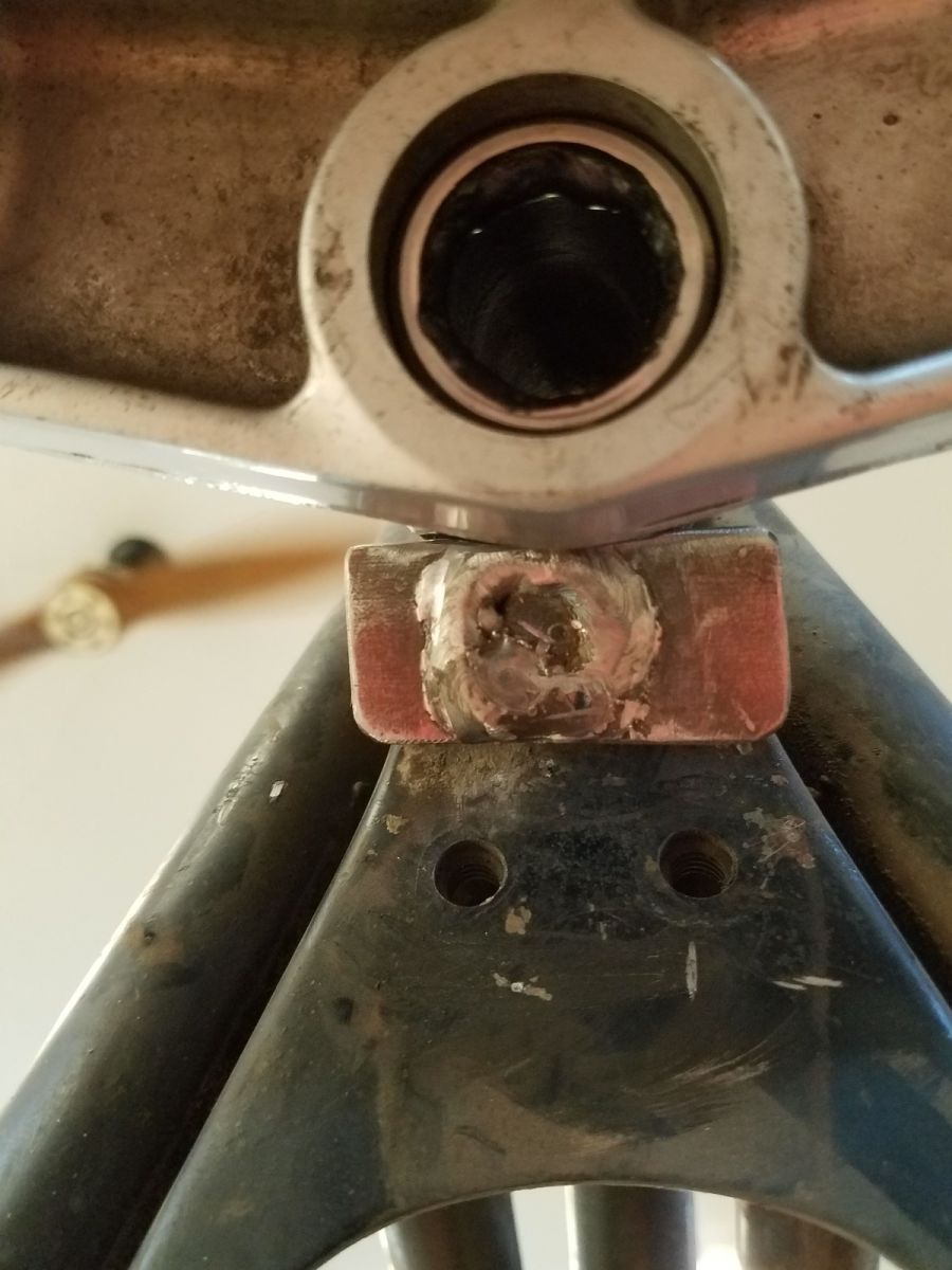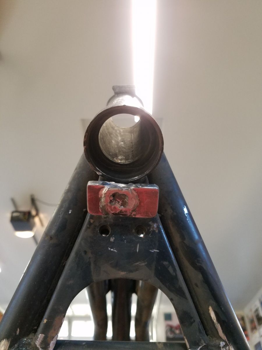 I have been working on the new design for the steering stop. I had a couple of ideas, but went with the simplest design. There is a round post that extends down that the stock lower triple tree would contact with two cast tabs. I ended up welding a .25" thick x 1.00" steel flat bar on the end of that post - the edges with contact the outer edge of the Honda lower triple clamp. Sorry, no pictures yet. I will post some when I remember to bring my phone to the shop! :blush: