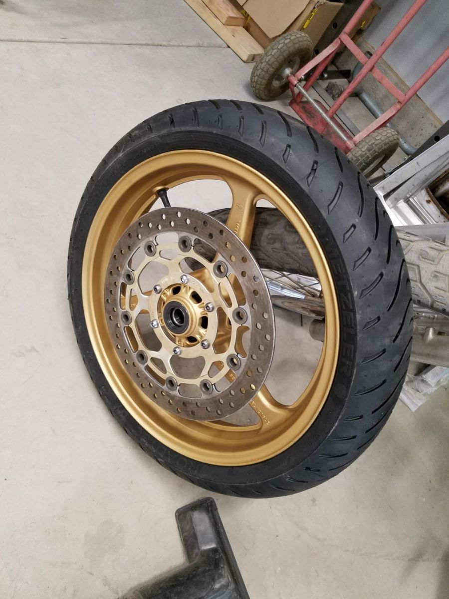 To get the angle correct on the steering stops I need to get the front end assebled and the tank back on. Sitting on the new tires (temporarily) for the first time.