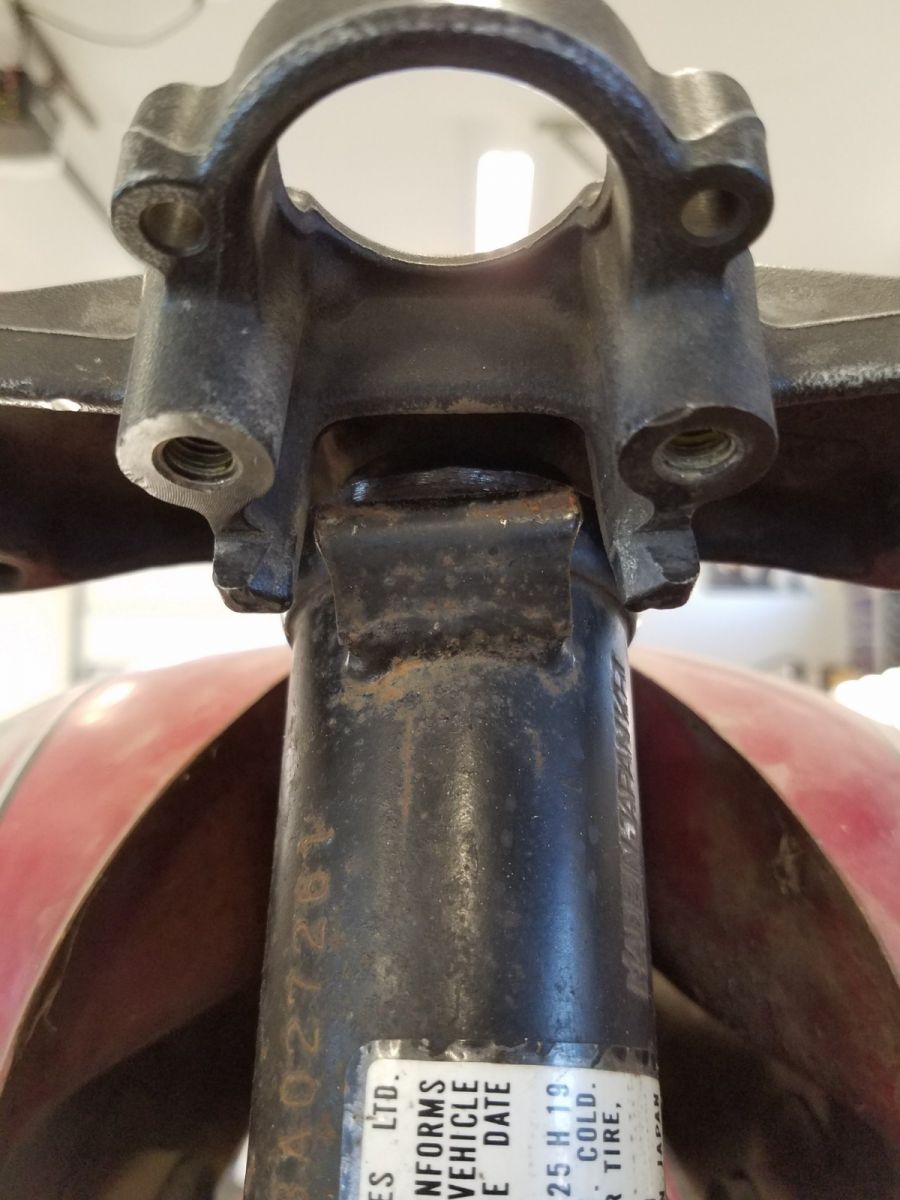 Ran into a small issue. There is a stock bracket welded to the steering head that gets in the way of the Honda upper triple clamp. It has to get cut off, so everything needs to come back apart.