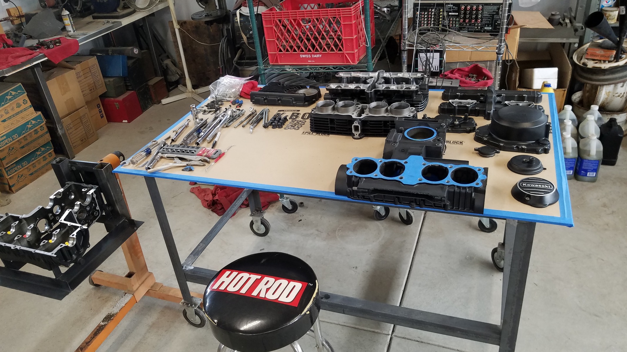 Cleaned off my weld table and covered with thick single layer cardboard. Disassembled the motor, and getting ready to start the next round of cleaning and inspection.