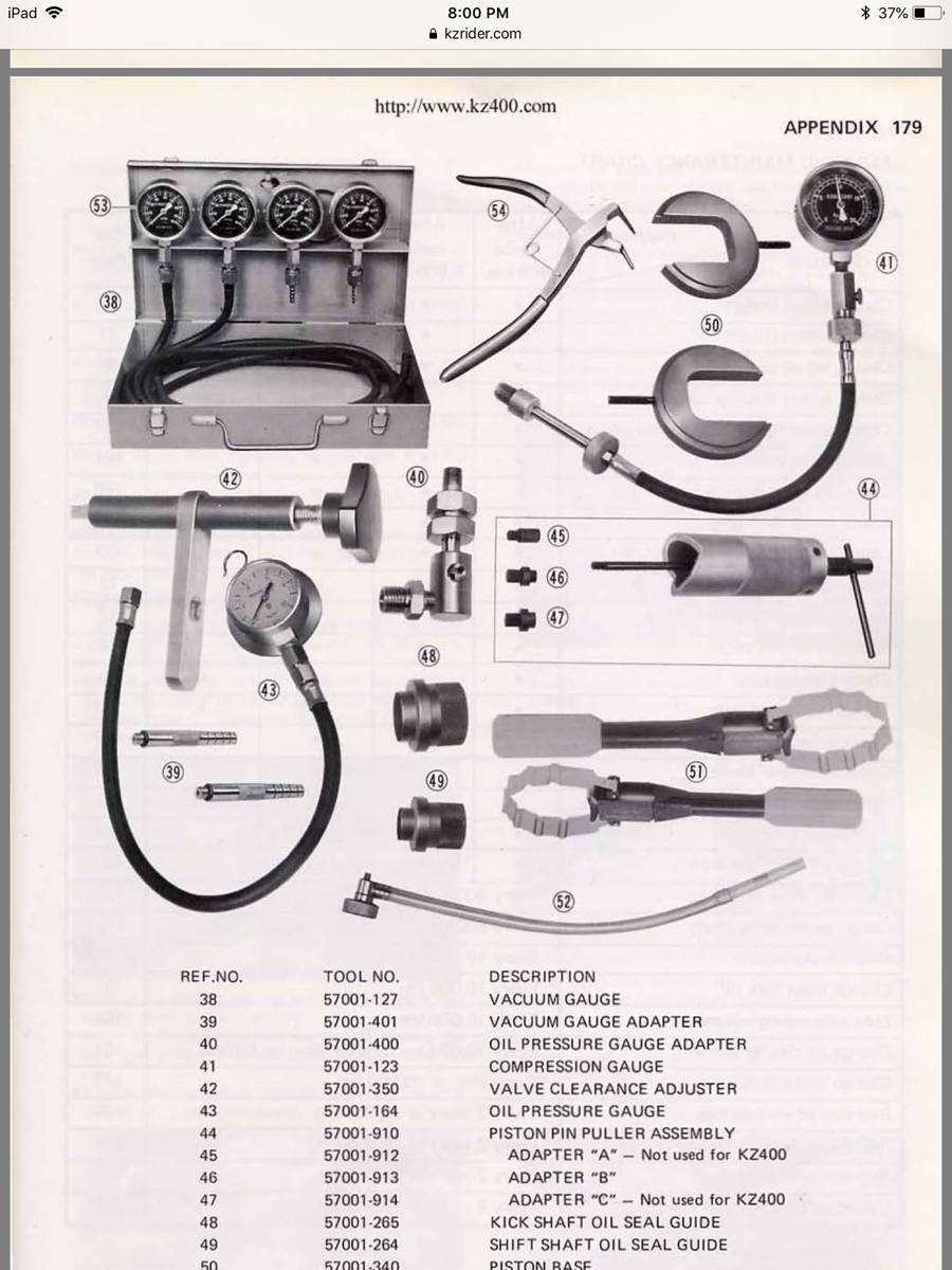 Like I said before I used two of the Suzuki piston tools and their bands to get my Kz1000 73mm pistons and rings into their bores. The two holders and the two bands cost me right around 110 dollars for the pair. I believe Kawasaki now uses basically the same type of tool on their newer bikes. I don't have a late model shop manual to check if they do or not. Kawasaki special tools were always cheaper than the similar tool from Suzuki. The hose clamps are a real pain in the ass to work with if you ask me!!!