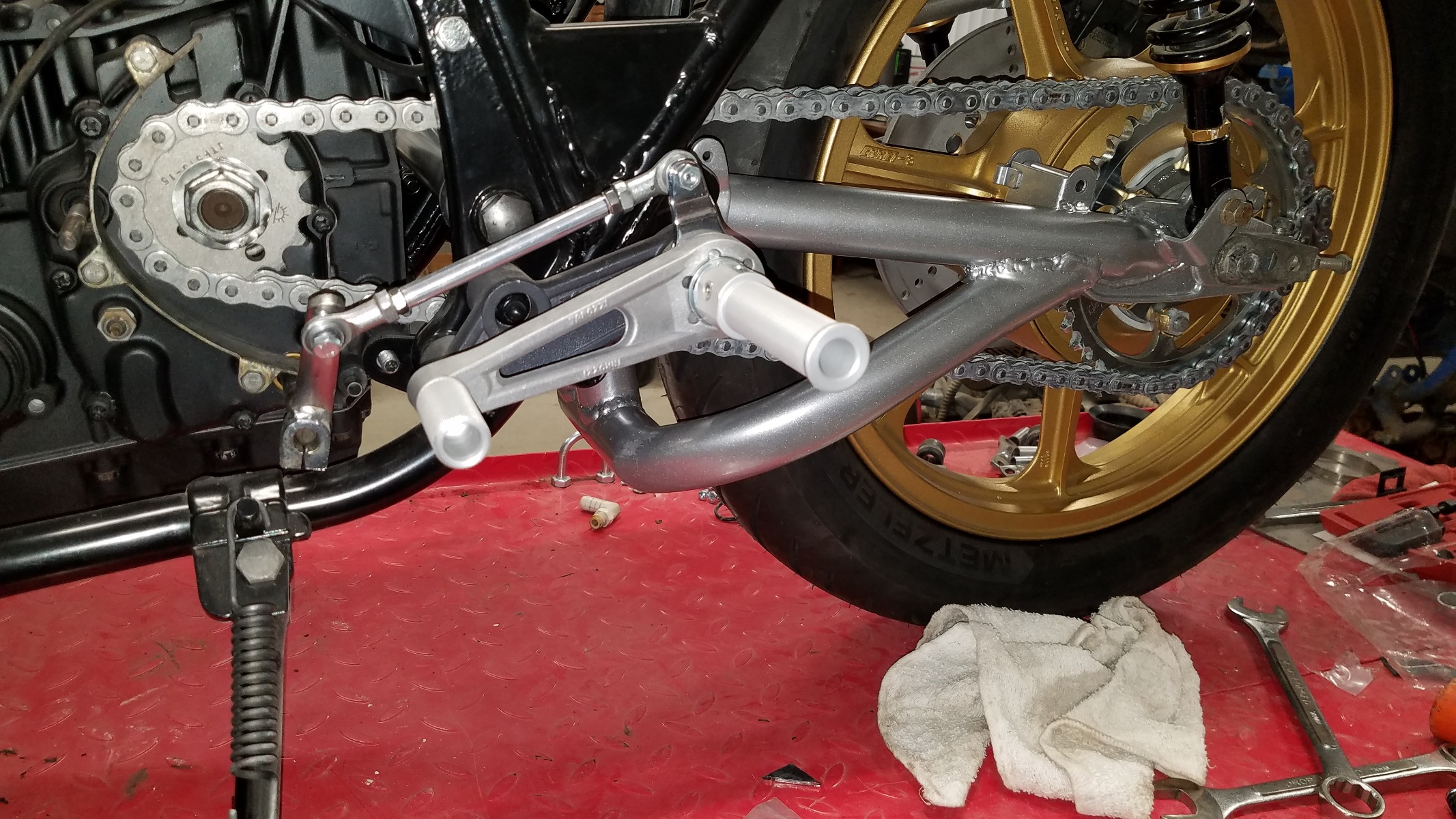Tinkered on the bike for a while today, but it all seems to be "invisible" work. No real changes in appearance. I cut my chain to length, and riveted the master link on. Adjusted the chain tension and torqued the rear axle. Finished with all of the engine mount bolts - a couple had to be hand ground since the same size bolts I could only find with bigger hex heads. All of the motor mounts are torqued now. Filled and bled the rear brakes, and torqued the counter shaft sprocket nut. Sometimes you can tinker for hours and step back and say you got a lot done, but none of it shows!