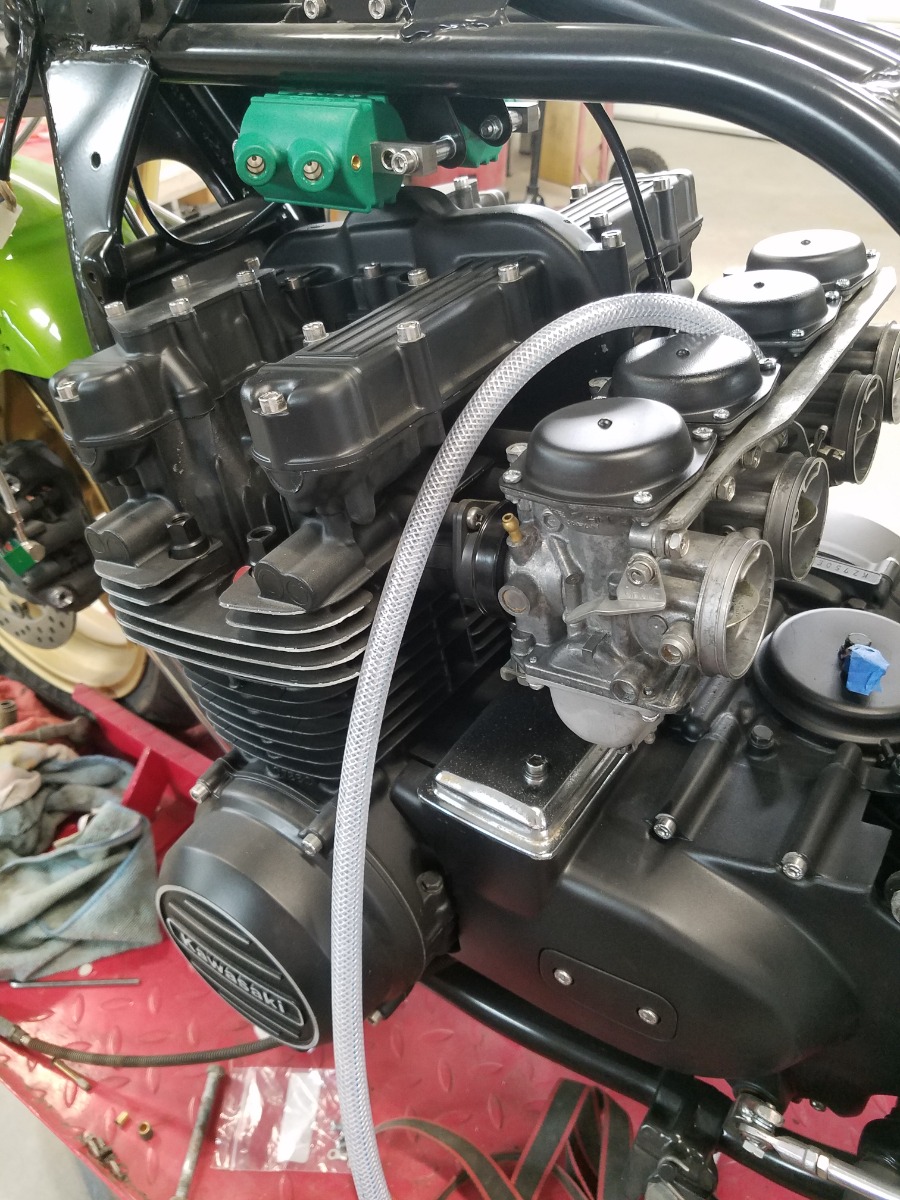 I got the replacement o-ring for the float bowl, and finished up the carbs. I like the black top caps even more now that I see them on the engine! The new throttle cable is lubed, installed, and adjusted. Now to finish cleaning the wiring harness so it can be installed.
