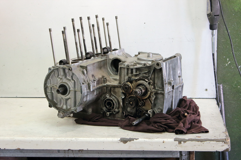 The engine I have, as far as I could identify it, is 1978 KZ650 C2 engine. All engine’ hardware was original and looked untouched. Seemed like no one before me disassembled crankcase. When I began to unscrew crankcase bolts it was alike to those scenes in films when archeologists open untouched tomb of some Egyptian pharaoh: puffs of the air and white powder of oxidized aluminum and zinc entombed for thirty years under the bolts heads. I took that for a good sign.