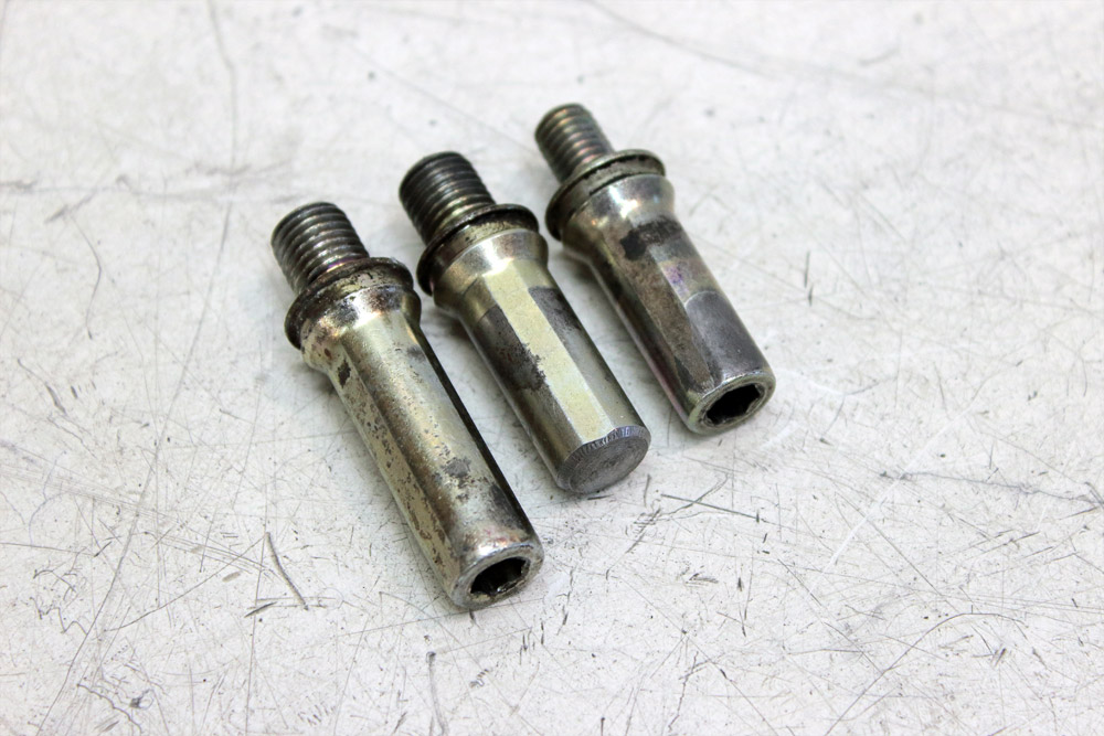 Whole Honda “inboard ventilated disc” system is quite unusual and it has a lot of specific features. One of them is how brake boards are mounted to the fork. Originally Honda CBX550 right brake board is prevented from rotation around wheel axle by special bolt with 12mm thread and recessed to 10mm pin-like nose. Therefore there is 10mm hole for bolt nose in board, near the upper brake caliper guide pin.