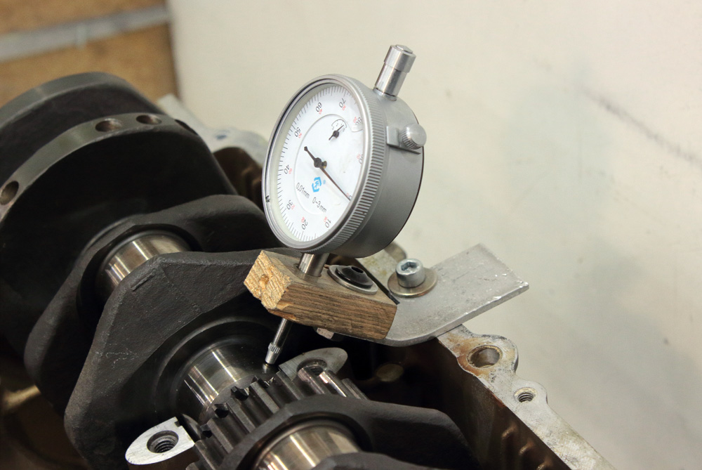 Sure, I also measured crankshaft runout. Decent V-blocks might be quite expensive; however it’s very simple to do runout measurement without them as we already have all parts necessary for measuring. Just put first and fifth (first and last) crankcase bearing inserts in their places in half of crankcase, oil them and then put crankshaft. There will be sufficient gap between all other crankshaft journals and crankcase and no harm would be done to bearing inserts in this way (just don’t forget to oil them). One also could easily attach dial gauge (indicator) to crankcase using piece of wood and some aluminum plate. This time I used old crankcase. Runout of my crankshaft was just as a book states: under 0.01mm.