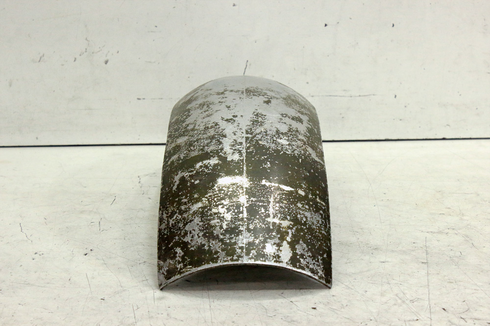 After secondary iterations front fender looked nice. I hammered it to condition where all remained flaws might be removed by sandpapering, however I borrowed an English wheel to finish the work properly. Current width of the fender is 130 mm and it perfectly fit 110/90-18″ tire. I suppose I’ll decrease width to 120mm after I treat it on English wheel.