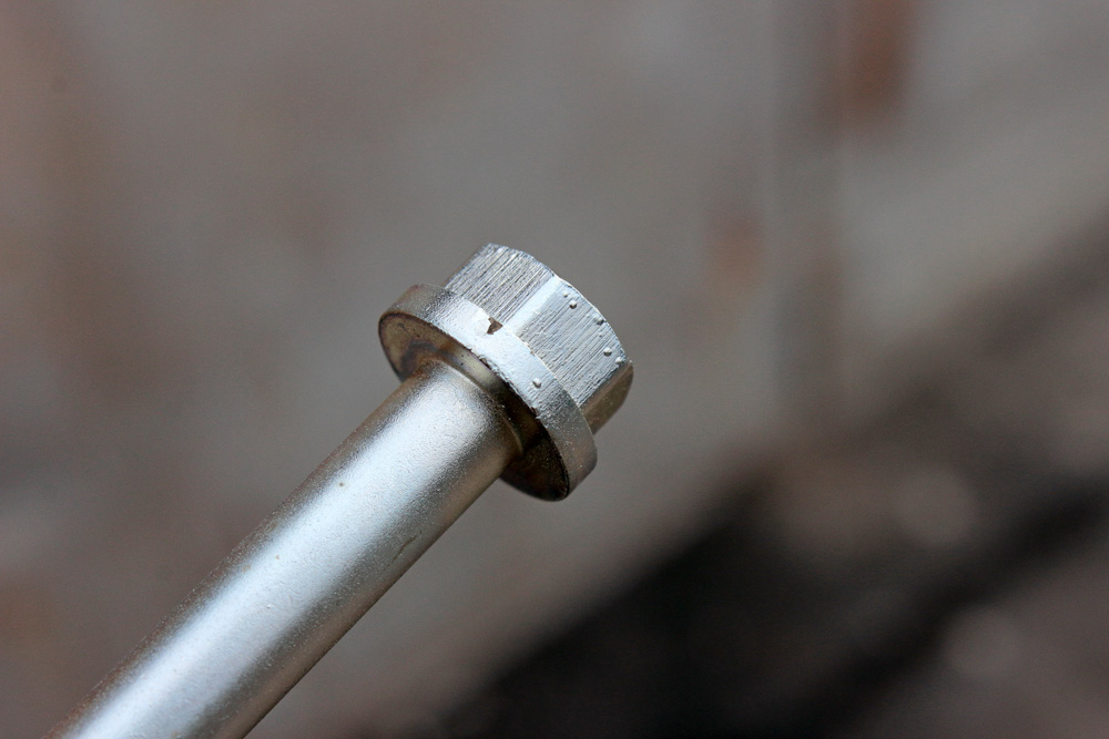 First of them was engine bolts. My initial plan was to clean, glass beads blast original bolts and re-plate with zinc. So one day I went to a company that provides zinc plating and gave them several dozens of prepared bolts: all degreased and glass beads blasted. Among them was a set of bolts for KZ650 crankcases. At first glance the result looked very nice. However, when I returned with a pack full of freshly plated hardware to my workshop and started sorting bolts, I found out that about 10% of it had plating defects. The defects looked like this: