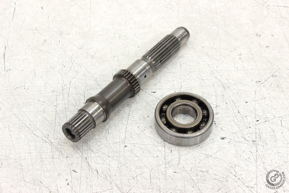 To remove the ball bearing from the secondary shaft I used a piece of aluminum pipe of suitable diameter: large enough to put over the gear that actuates the oil pump and over the boss on the secondary shaft but not larger than outer diameter of the bearing inner race. Being driven by the inner race, bearing could be reused, even as I have no such intentions.