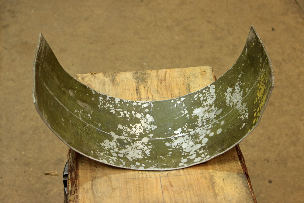 Regularly getting some unsolvable issues like lost parcel (with precious parts in it) and so on, I began to get slightly tired of the routine. I needed to make something more artistic than things I’ve been doing recently. So I decided to make aluminum front mudguard for Kawasaki KZ650 project. However, for my tired mind the very thought about driving through traffic jams to the nearest market where one may buy cut of 2mm aluminum sheet was disgusting. Hence I decided: to hell that 2mm aluminum, I’d better try to hammer front fender from 3mm aluminum I have in my supplies. Since I last time was hammering aluminum I’ve got couple of ideas how to do it better, and I anxious to test them. I took sheet of 3mm aluminum from the shelf, cut the strip of suitable width and bent it into some kind of half ring. Here it is, still mostly flat: