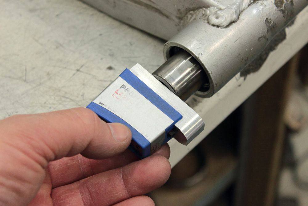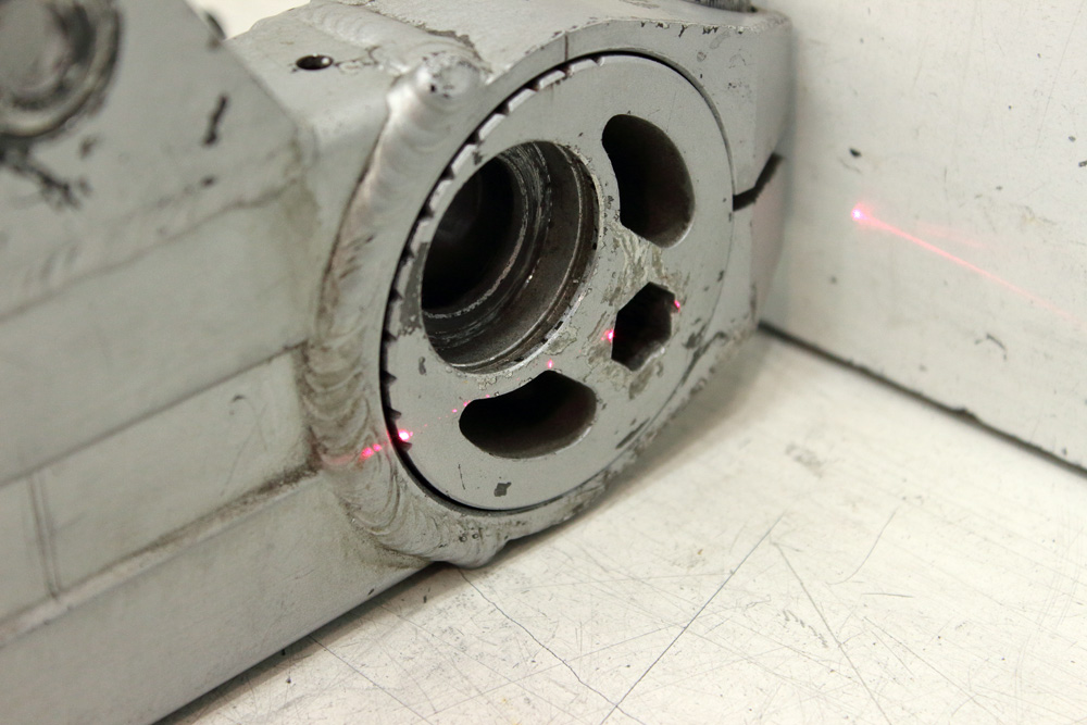 My next task was to check how shocks’ mounts on swingarm match shocks’ mounts on frame. Here I had no choice, but use shock mounts on swingarm as base for laser tool. To decrease influence of fact that mounts might be not strictly perpendicular to swingarm’ sleeve I decreased distance between upper and lower mounts: