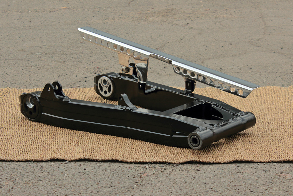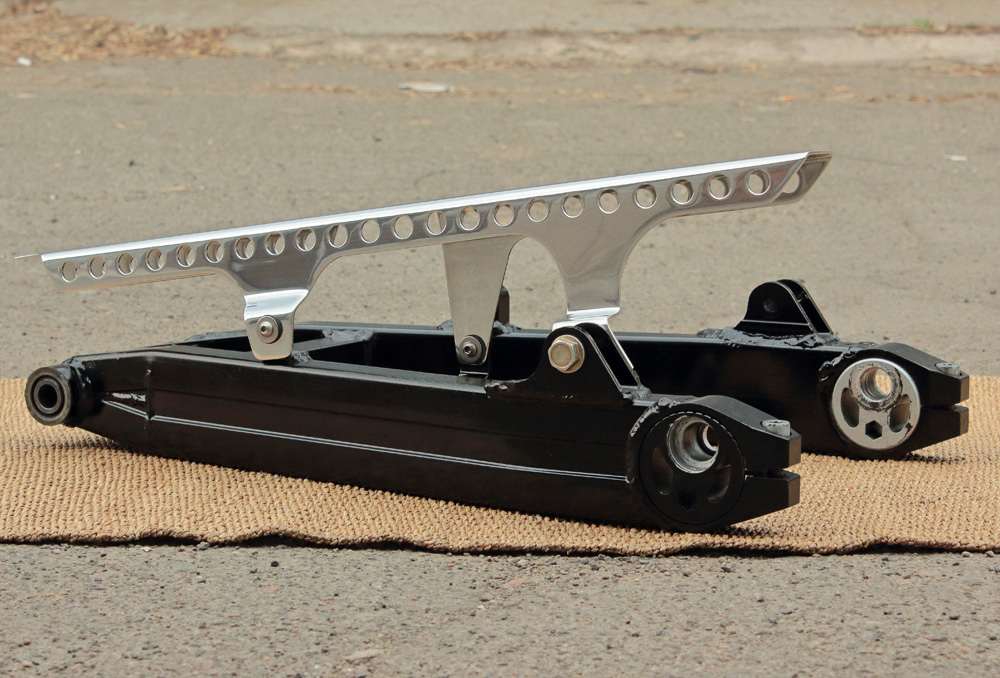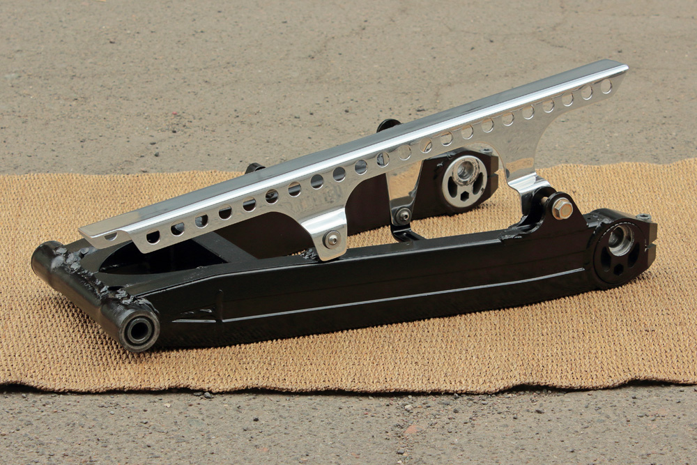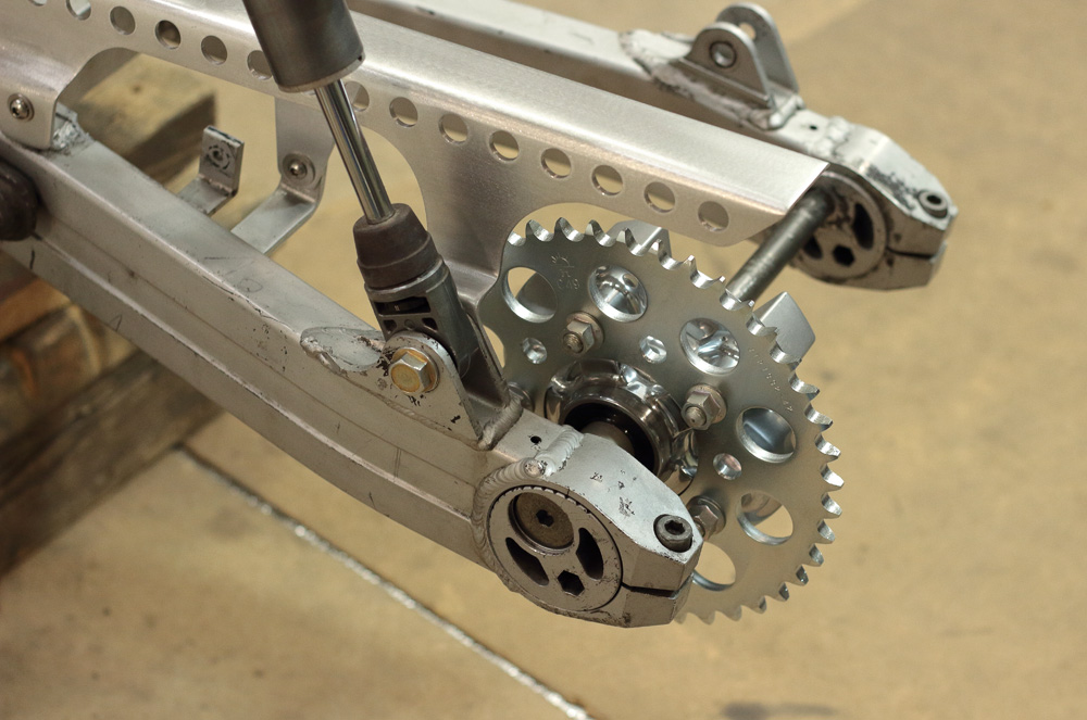 According to my plan, the swingram would be painted in black. But even now, when I seemingly finished with its modification, it would be unadvisable to glass blast it and paint it, so to cease my curiosity about its future look I painted swingarm with rattle can. I did it with swingarm as it was: not bothering with its sanding, just removed some flakes of old paint and cleaned the grease. So don’t take photos below as a final result, it’s nothing but modeling. And I should admit, that combination of polished aluminum of chain guard and black of swingarm made contraption slightly Star Wars’ looking. I already like it.