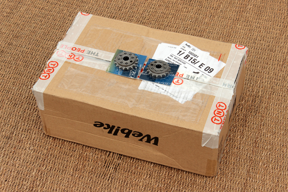 Here they are: two PMC cam chain idler sprockets. Content of parcel in comparison to box reminds me of dried peas in a child’s toy.
